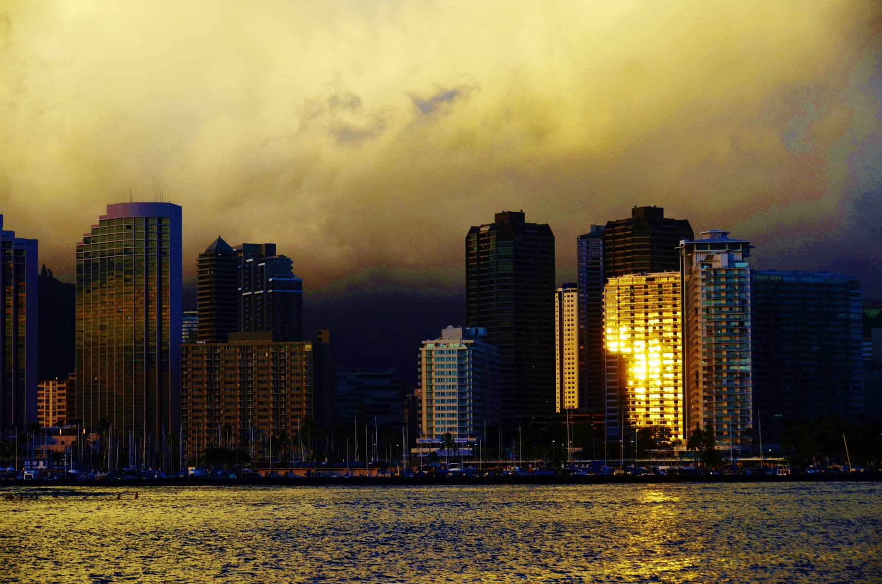 ビルに反射するハワイの夕日